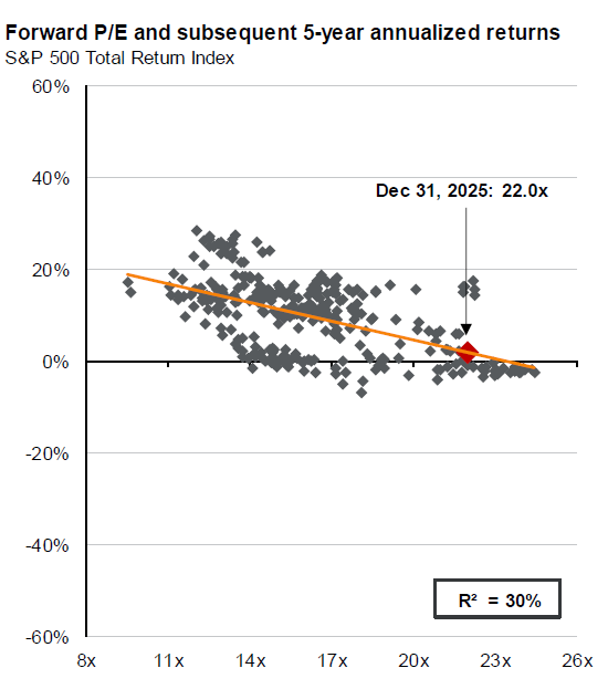Source: FactSet, Refinitiv Datastream, Standard & Poor’s, J.P. Morgan Asset Management. Returns are 12-month and 60-month annualized returns, measured monthly, beginning 12/31/1993. R2 represents the percent of variation in total return that can be explained by forward P/E ratios. The forward P/E ratio is the most recent S&P 500 index price divided by consensus analyst estimates for earnings in the next 12 months, provided by IBES since December 1993 and FactSet since January 2022. Past performance is no guarantee of future results.